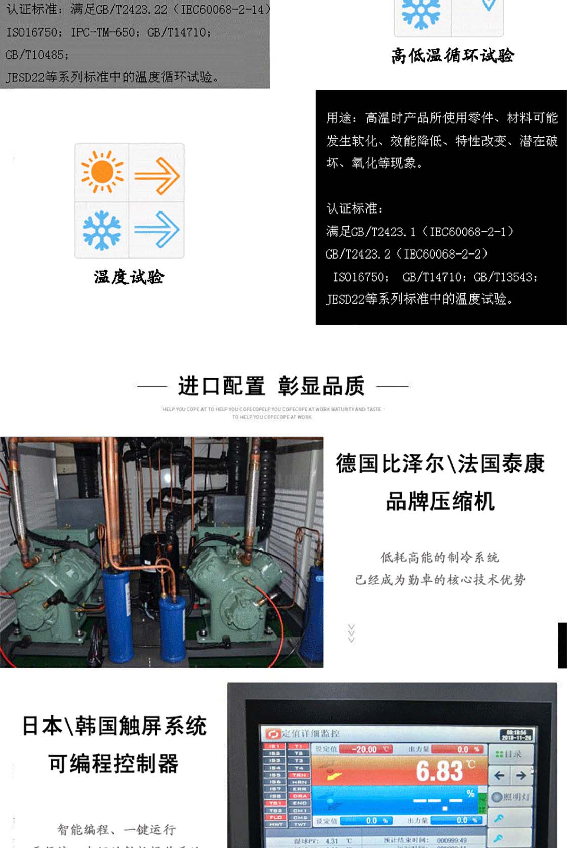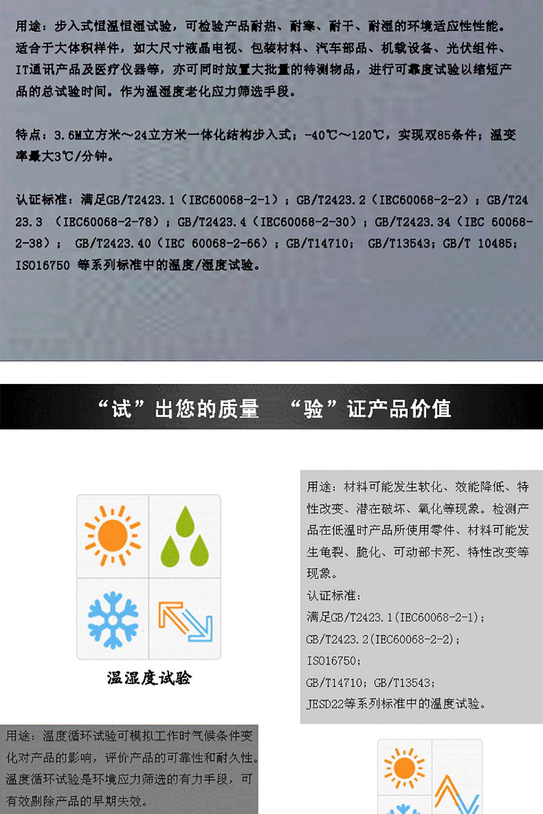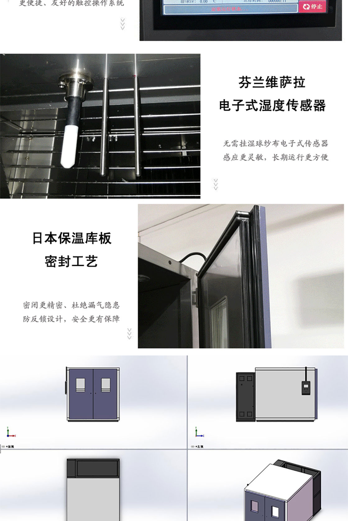 步入式試驗箱應用于國防工業(yè)、航天工業(yè)、自動化零組件汽車部件、電子電器件、塑膠、化工、制藥工業(yè)及相關產(chǎn)品之耐熱、耐寒測試,為產(chǎn)業(yè)界提供大型零件,半成品,成品之大型溫濕度測試環(huán)境空間,適合于測試產(chǎn)品量多、體積大之試驗設備。